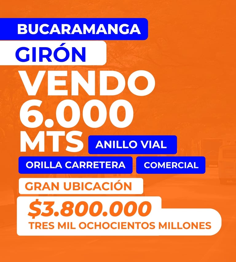 Lote de 6.000 m² ubicado en el Anillo Vial de Girón, con acceso directo a la carretera. Ideal para proyectos comerciales en una zona de alto desarrollo y excelente conectividad.